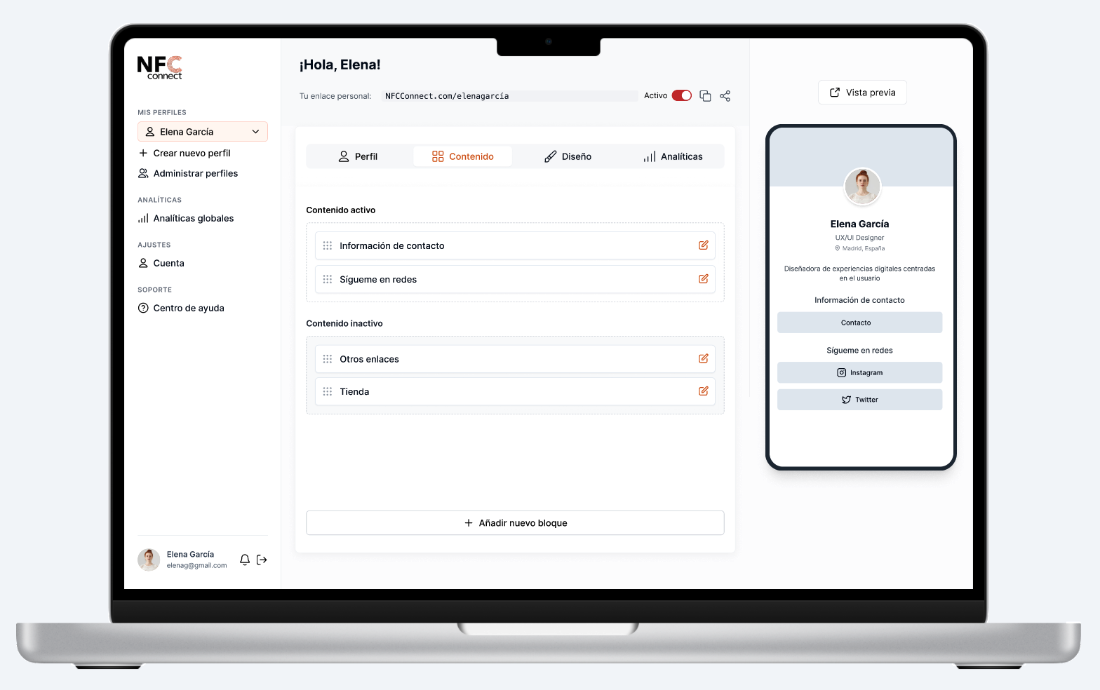 Estamos trabajando en la creación de una nueva plataforma para ofrecerte un servicio mucho más completo. Muy pronto vas a poder crear y personalizar tus perfiles digitales, gestionar tus enlaces, mostrar tu información de contacto, consultar analíticas y mucho más… todo desde un solo lugar, fácil y rápido.